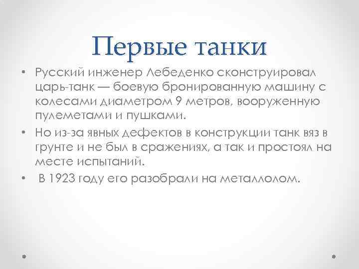 Первые танки • Русский инженер Лебеденко сконструировал царь-танк — боевую бронированную машину с колесами диаметром 9 метров, вооруженную пулеметами и пушками. • Но из-за явных дефектов в конструкции танк вяз в грунте и не был в сражениях, а так и простоял на месте испытаний. • В 1923 году его разобрали на металлолом.