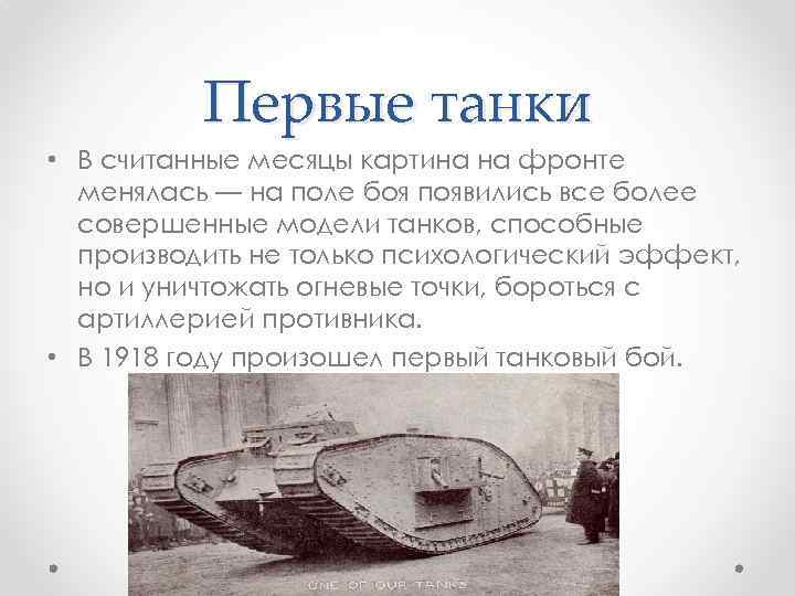 Первые танки • В считанные месяцы картина на фронте менялась — на поле боя появились все более совершенные модели танков, способные производить не только психологический эффект, но и уничтожать огневые точки, бороться с артиллерией противника. • В 1918 году произошел первый танковый бой.