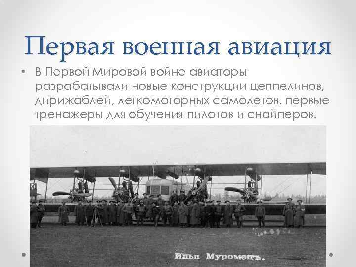 Первая военная авиация • Первая мировая война сделала авиацию полноценным родом войск. • Появились первые самолеты разведчики, истребители и бомбардировщики. • Настоящей легендой «германской» войны стал «Илья Муромец» — российский тяжелый самолет, который немцы не могли сбить полтора года.
