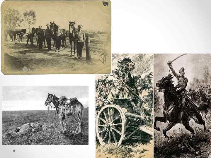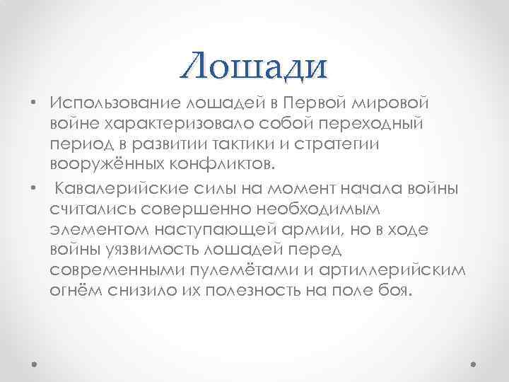 Лошади • Использование лошадей в Первой мировой войне характеризовало собой переходный период в развитии тактики и стратегии вооружённых конфликтов. • Кавалерийские силы на момент начала войны считались совершенно необходимым элементом наступающей армии, но в ходе войны уязвимость лошадей перед современными пулемётами и артиллерийским огнём снизило их полезность на поле боя.