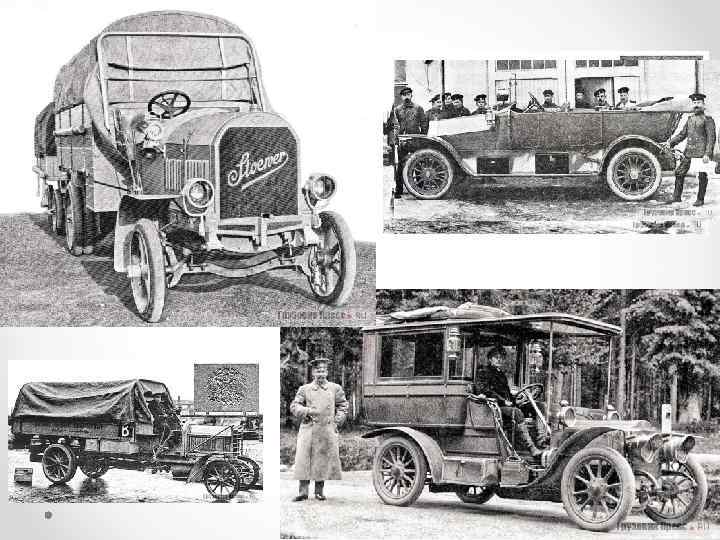 Автомобили • К началу Первой мировой войны в Русской императорской армии (РИА) имелось всего 711 автомобилей и два трактора. • Среди них: 259 легковых машин, 418 грузовиков и 34 автомобиля специального назначения. • Кроме того, в наличии был 101 мотоцикл. Большинство из них находилось в сформированной в 1910 году в Петербурге Учебной автомобильной роте под командой полковника П. И. Секретева, в штабных и крепостных автомобильных командах и авиационных частях.