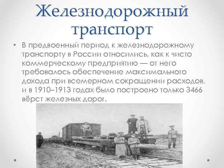 Железнодорожный транспорт • В предвоенный период к железнодорожному транспорту в России относились, как к чисто коммерческому предприятию — от него требовалось обеспечение максимального дохода при всемерном сокращении расходов, и в 1910– 1913 годах было построено только 3466 вёрст железных дорог.