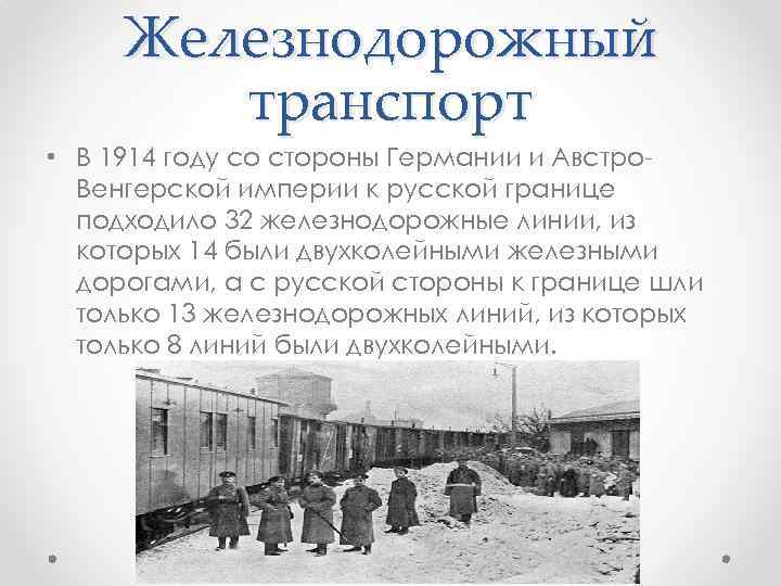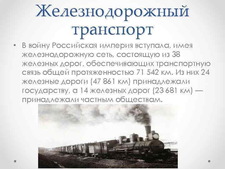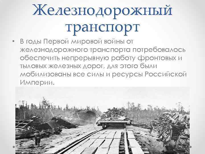 Железнодорожный транспорт • В годы Первой мировой войны от железнодорожного транспорта потребовалось обеспечить непрерывную работу фронтовых и тыловых железных дорог, для этого были мобилизованы все силы и ресурсы Российской Империи.