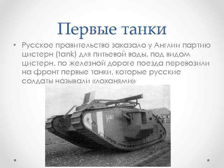 Первые танки • Русское правительство заказало у Англии партию цистерн (tank) для питьевой воды, под видом цистерн, по железной дороге поезда перевозили на фронт первые танки, которые русские солдаты называли «лоханями»