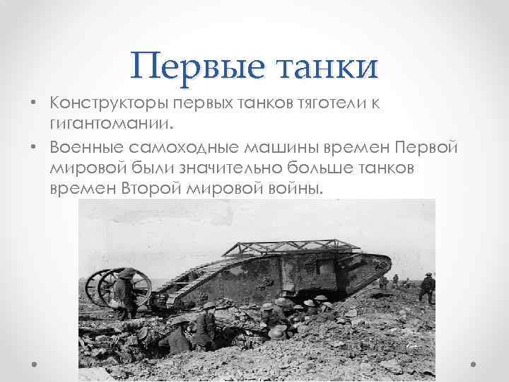 Первые танки • Конструкторы первых танков тяготели к гигантомании. • Военные самоходные машины времен Первой мировой были значительно больше танков времен Второй мировой войны.