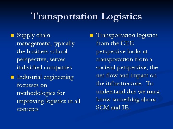 Transportation Logistics n n Supply chain management, typically the business school perspective, serves individual companies Industrial engineering focusses on methodologies for improving logistics in all contexts n Transportation logistics from the CEE perspective looks at transportation from a societal perspective, the net flow and impact on the infrastructure. To understand this we must know something about SCM and IE.
