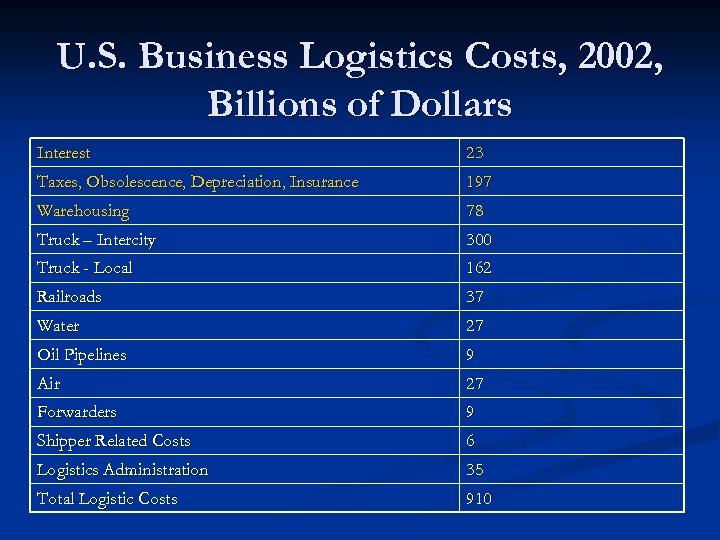 U. S. Business Logistics Costs, 2002, Billions of Dollars Interest 23 Taxes, Obsolescence, Depreciation, Insurance 197 Warehousing 78 Truck – Intercity 300 Truck - Local 162 Railroads 37 Water 27 Oil Pipelines 9 Air 27 Forwarders 9 Shipper Related Costs 6 Logistics Administration 35 Total Logistic Costs 910