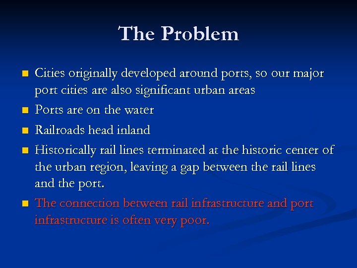 The Problem n n n Cities originally developed around ports, so our major port cities are also significant urban areas Ports are on the water Railroads head inland Historically rail lines terminated at the historic center of the urban region, leaving a gap between the rail lines and the port. The connection between rail infrastructure and port infrastructure is often very poor.