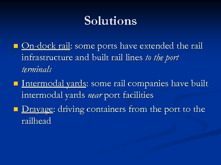 Solutions On-dock rail: some ports have extended the rail infrastructure and built rail lines to the port terminals n Intermodal yards: some rail companies have built intermodal yards near port facilities n Drayage: driving containers from the port to the railhead n