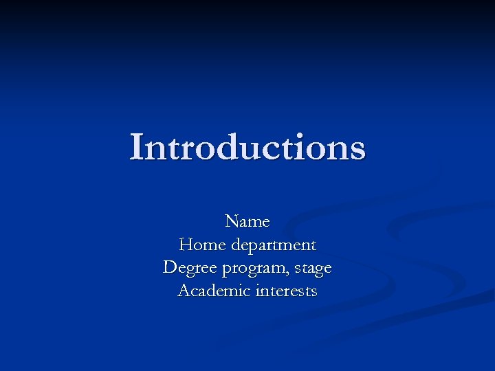 Introductions Name Home department Degree program, stage Academic interests