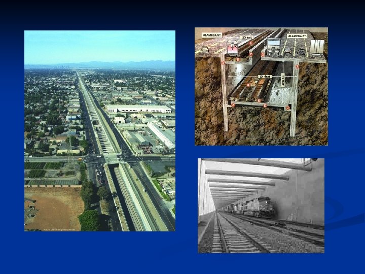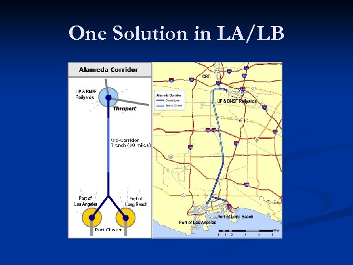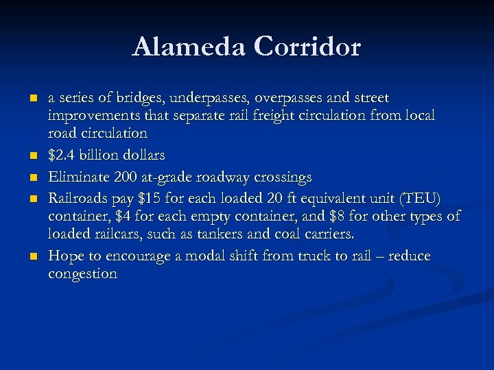 Alameda Corridor n n n a series of bridges, underpasses, overpasses and street improvements that separate rail freight circulation from local road circulation $2. 4 billion dollars Eliminate 200 at-grade roadway crossings Railroads pay $15 for each loaded 20 ft equivalent unit (TEU) container, $4 for each empty container, and $8 for other types of loaded railcars, such as tankers and coal carriers. Hope to encourage a modal shift from truck to rail – reduce congestion