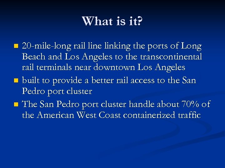 What is it? 20 -mile-long rail line linking the ports of Long Beach and Los Angeles to the transcontinental rail terminals near downtown Los Angeles n built to provide a better rail access to the San Pedro port cluster n The San Pedro port cluster handle about 70% of the American West Coast containerized traffic n