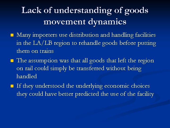 Lack of understanding of goods movement dynamics n n n Many importers use distribution and handling facilities in the LA/LB region to rehandle goods before putting them on trains The assumption was that all goods that left the region on rail could simply be transferred without being handled If they understood the underlying economic choices they could have better predicted the use of the facility