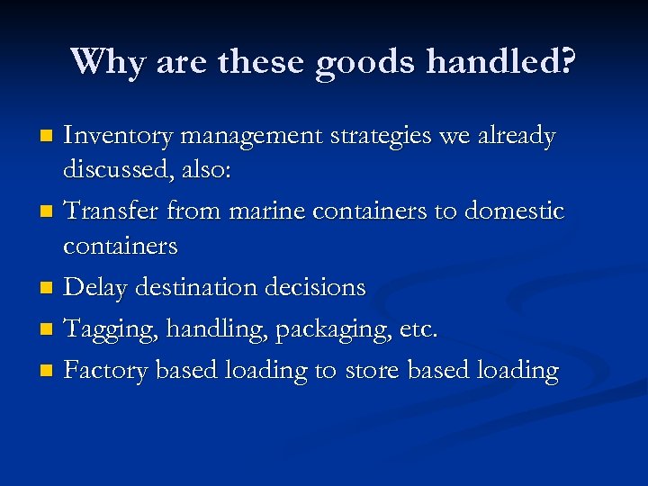Why are these goods handled? Inventory management strategies we already discussed, also: n Transfer from marine containers to domestic containers n Delay destination decisions n Tagging, handling, packaging, etc. n Factory based loading to store based loading n
