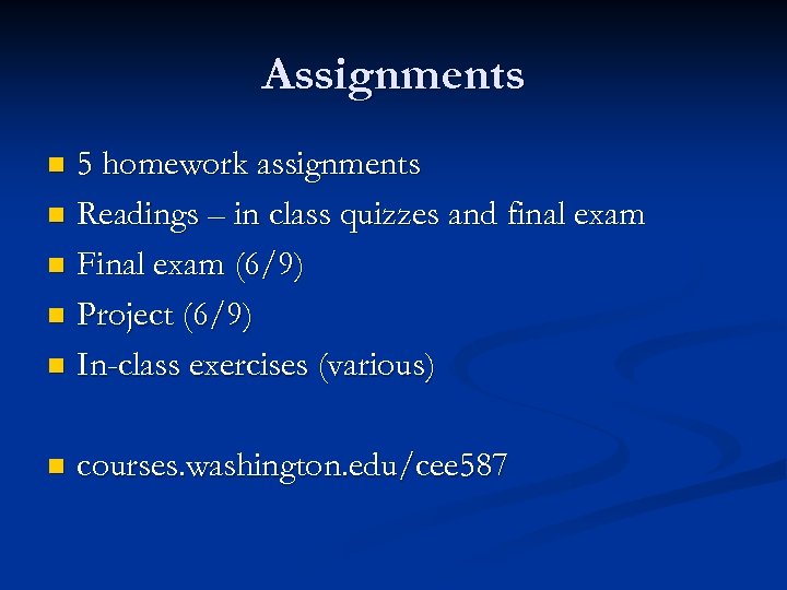 Assignments 5 homework assignments n Readings – in class quizzes and final exam n Final exam (6/9) n Project (6/9) n In-class exercises (various) n n courses. washington. edu/cee 587
