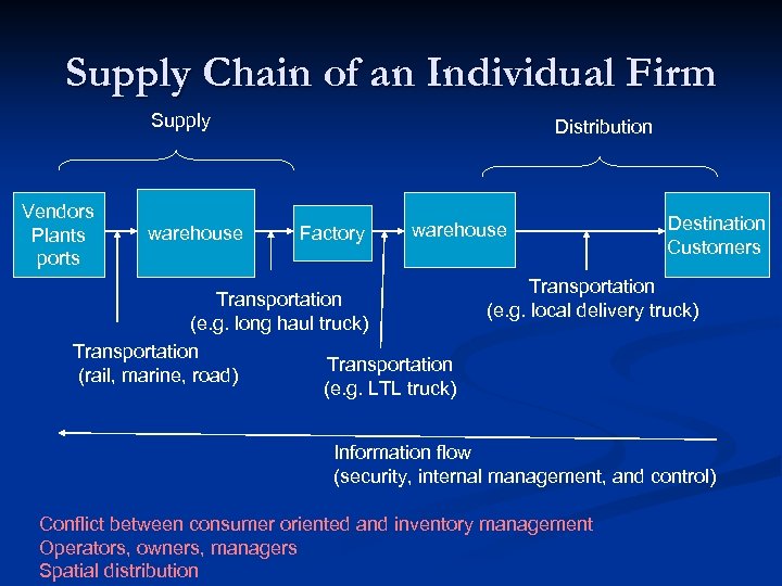 Supply Chain of an Individual Firm Supply Vendors Plants ports warehouse Distribution Factory warehouse Transportation (e. g. long haul truck) Transportation (rail, marine, road) (e. g. LTL truck) Destination Customers Transportation (e. g. local delivery truck) Information flow (security, internal management, and control) Conflict between consumer oriented and inventory management Operators, owners, managers Spatial distribution