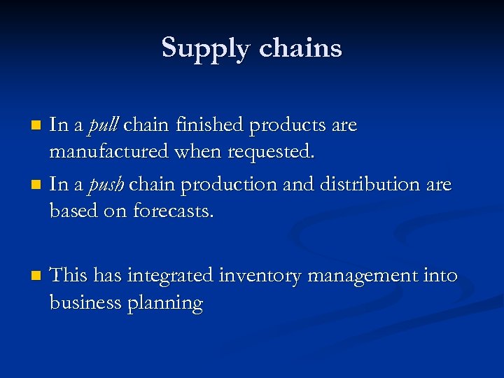 Supply chains In a pull chain finished products are manufactured when requested. n In a push chain production and distribution are based on forecasts. n n This has integrated inventory management into business planning