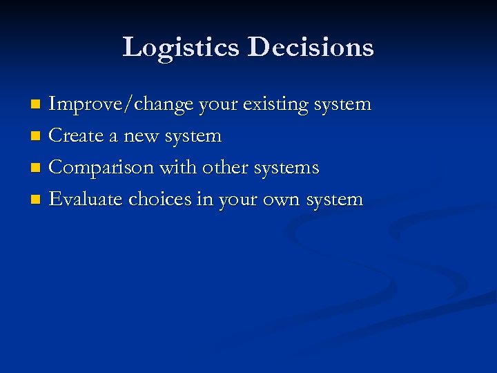 Logistics Decisions Improve/change your existing system n Create a new system n Comparison with other systems n Evaluate choices in your own system n