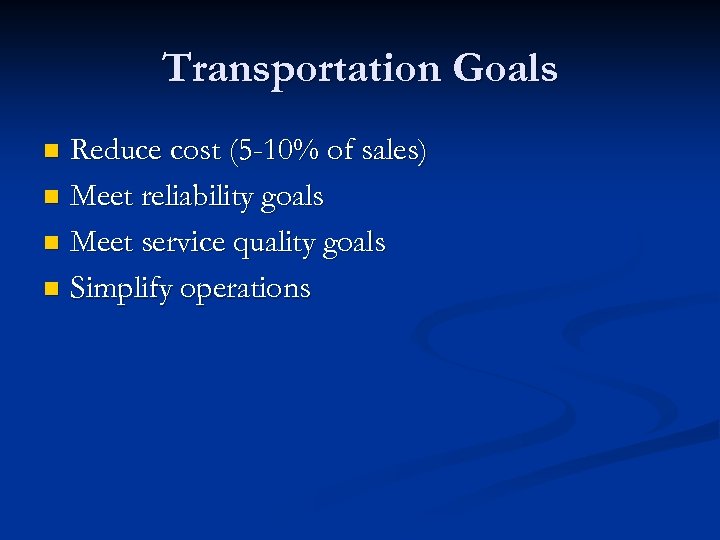 Transportation Goals Reduce cost (5 -10% of sales) n Meet reliability goals n Meet service quality goals n Simplify operations n
