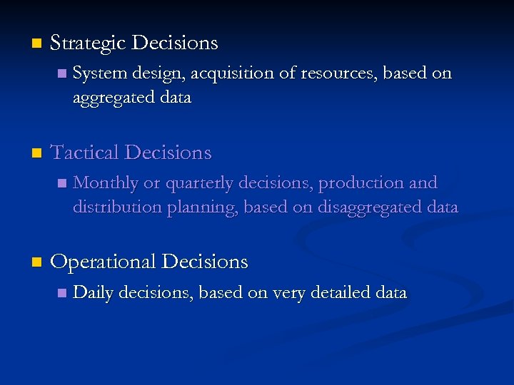 n Strategic Decisions n n Tactical Decisions n n System design, acquisition of resources, based on aggregated data Monthly or quarterly decisions, production and distribution planning, based on disaggregated data Operational Decisions n Daily decisions, based on very detailed data