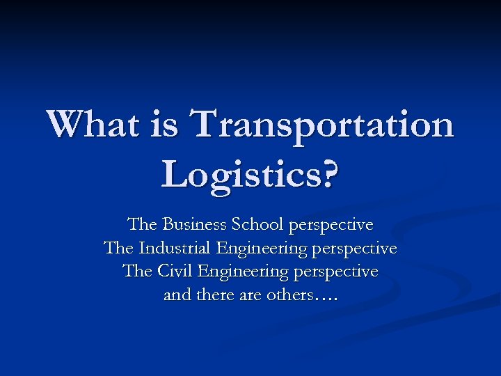 What is Transportation Logistics? The Business School perspective The Industrial Engineering perspective The Civil Engineering perspective and there are others….
