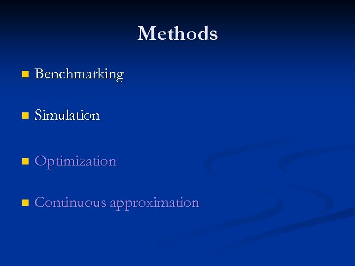 Methods n Benchmarking n Simulation n Optimization n Continuous approximation