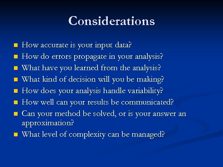 Considerations n n n n How accurate is your input data? How do errors propagate in your analysis? What have you learned from the analysis? What kind of decision will you be making? How does your analysis handle variability? How well can your results be communicated? Can your method be solved, or is your answer an approximation? What level of complexity can be managed?