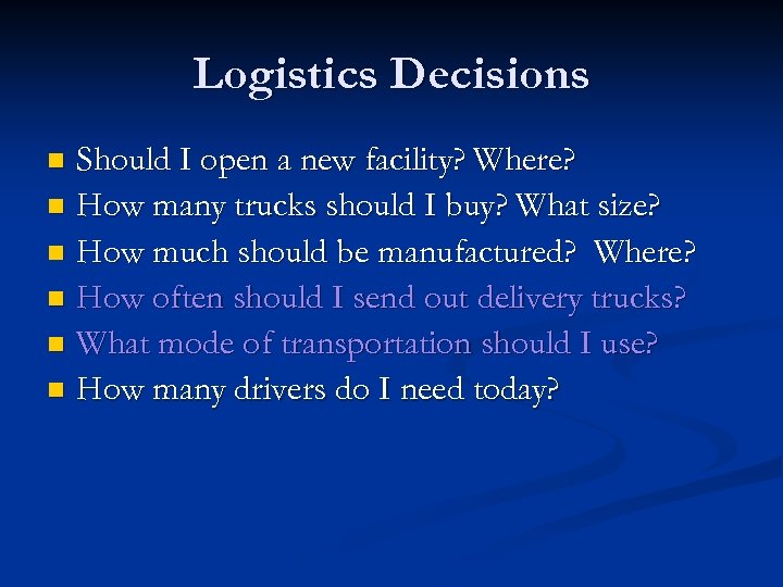 Logistics Decisions Should I open a new facility? Where? n How many trucks should I buy? What size? n How much should be manufactured? Where? n How often should I send out delivery trucks? n What mode of transportation should I use? n How many drivers do I need today? n