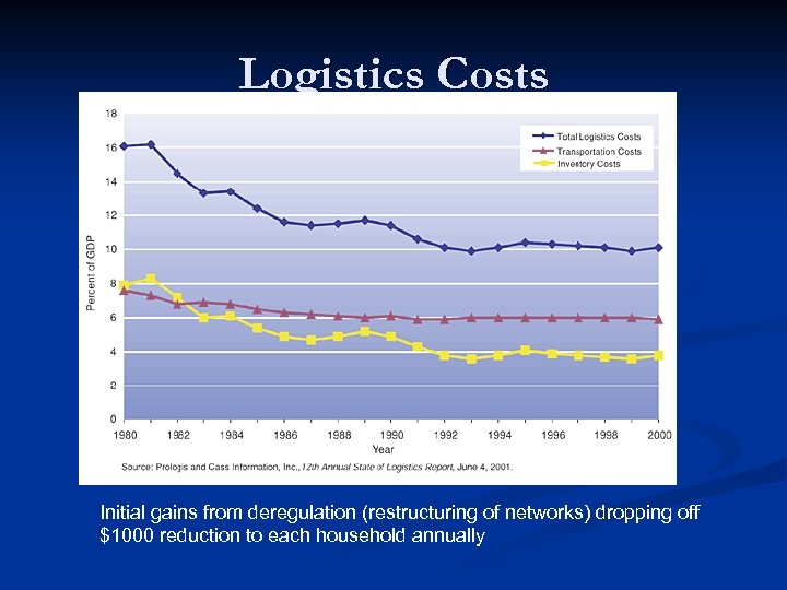 Logistics Costs Initial gains from deregulation (restructuring of networks) dropping off $1000 reduction to each household annually