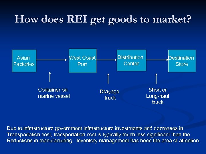 How does REI get goods to market? Asian Factories West Coast Port Container on marine vessel Distribution Center Drayage truck Destination Store Short or Long-haul truck Due to infrastructure government infrastructure investments and decreases in Transportation cost, transportation cost is typically much less significant than the Reductions in manufacturing. Inventory management has been the area of attention.