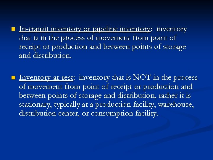 n In-transit inventory or pipeline inventory: inventory that is in the process of movement from point of receipt or production and between points of storage and distribution. n Inventory-at-rest: inventory that is NOT in the process of movement from point of receipt or production and between points of storage and distribution, rather it is stationary, typically at a production facility, warehouse, distribution center, or consumption facility.