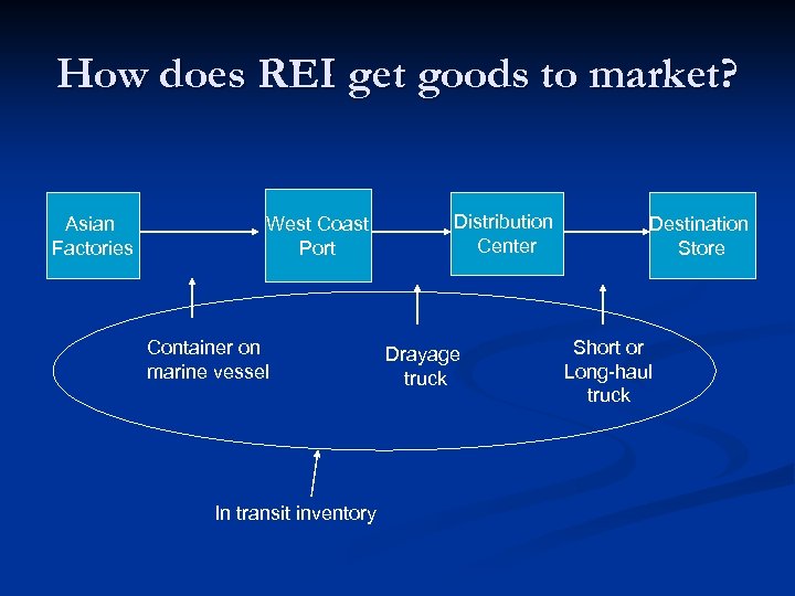 How does REI get goods to market? Asian Factories West Coast Port Container on marine vessel In transit inventory Distribution Center Drayage truck Destination Store Short or Long-haul truck