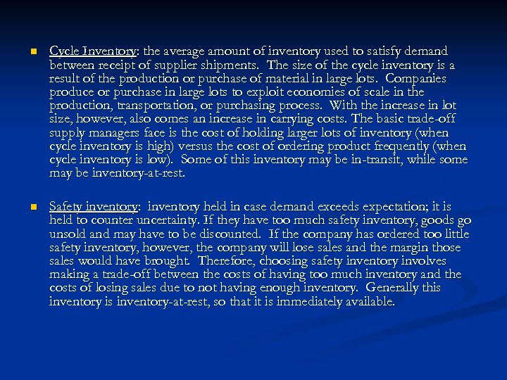 n Cycle Inventory: the average amount of inventory used to satisfy demand between receipt of supplier shipments. The size of the cycle inventory is a result of the production or purchase of material in large lots. Companies produce or purchase in large lots to exploit economies of scale in the production, transportation, or purchasing process. With the increase in lot size, however, also comes an increase in carrying costs. The basic trade-off supply managers face is the cost of holding larger lots of inventory (when cycle inventory is high) versus the cost of ordering product frequently (when cycle inventory is low). Some of this inventory may be in-transit, while some may be inventory-at-rest. n Safety inventory: inventory held in case demand exceeds expectation; it is held to counter uncertainty. If they have too much safety inventory, goods go unsold and may have to be discounted. If the company has ordered too little safety inventory, however, the company will lose sales and the margin those sales would have brought. Therefore, choosing safety inventory involves making a trade-off between the costs of having too much inventory and the costs of losing sales due to not having enough inventory. Generally this inventory-at-rest, so that it is immediately available.