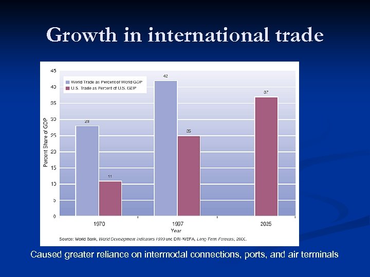 Growth in international trade Caused greater reliance on intermodal connections, ports, and air terminals