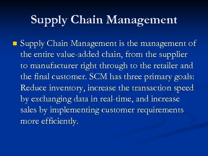 Supply Chain Management n Supply Chain Management is the management of the entire value-added chain, from the supplier to manufacturer right through to the retailer and the final customer. SCM has three primary goals: Reduce inventory, increase the transaction speed by exchanging data in real-time, and increase sales by implementing customer requirements more efficiently.