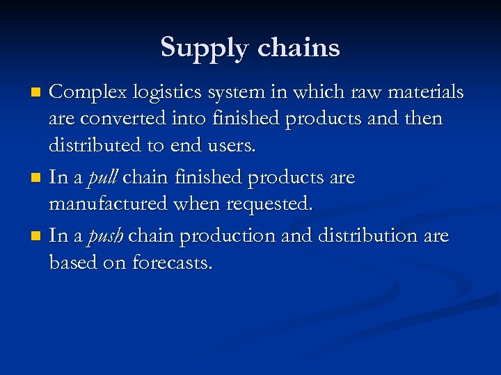 Supply chains Complex logistics system in which raw materials are converted into finished products and then distributed to end users. n In a pull chain finished products are manufactured when requested. n In a push chain production and distribution are based on forecasts. n
