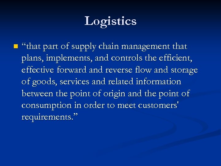 Logistics n “that part of supply chain management that plans, implements, and controls the efficient, effective forward and reverse flow and storage of goods, services and related information between the point of origin and the point of consumption in order to meet customers' requirements. ”