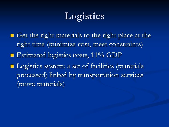 Logistics Get the right materials to the right place at the right time (minimize cost, meet constraints) n Estimated logistics costs, 11% GDP n Logistics system: a set of facilities (materials processed) linked by transportation services (move materials) n