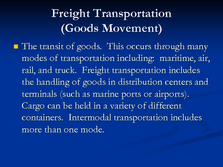 Freight Transportation (Goods Movement) n The transit of goods. This occurs through many modes of transportation including: maritime, air, rail, and truck. Freight transportation includes the handling of goods in distribution centers and terminals (such as marine ports or airports). Cargo can be held in a variety of different containers. Intermodal transportation includes more than one mode.