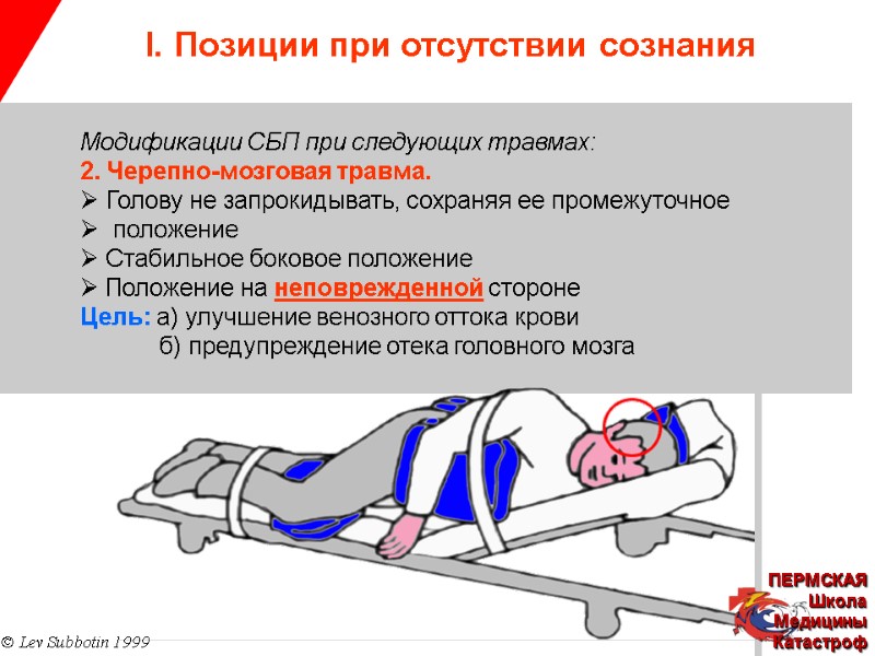 3. Травматический шок (острая кровопотеря). Стабильное боковое положение на носилках Ножной конец носилок под углом 15 градусов Цель: а) Поддержание проходимости дыхательных путей б) Улучшение венозного возврата крови к сердцу I. Позиции при отсутствии сознания © Lev Subbotin 1999