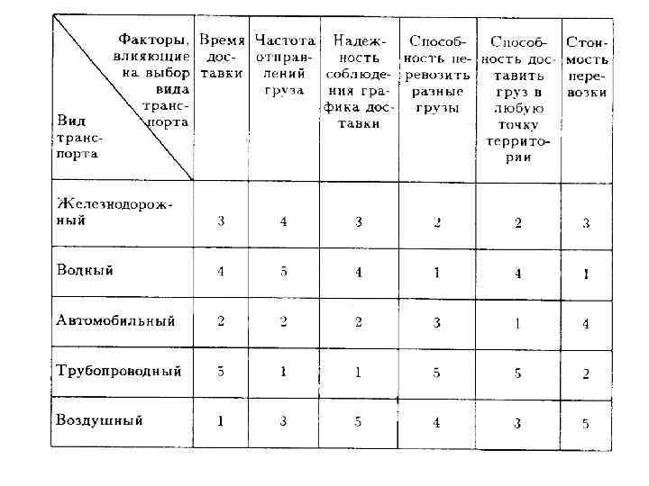 • Выделяют шесть основных факторов, влияющих на выбор вида транспорта. В следующей таблице дается оценка различных видов транспорта общего пользования по каждому из этих факторов. Единице соответствует наилучшее оценка.