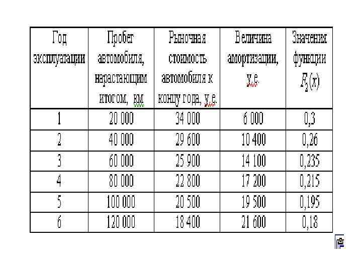 • Определим значения – F 2 (x) амортизация автомобиля, приходящую на 1 км пробега. Для этого разницу между первоначальной стоимостью автомобиля и его рыночной стоимостью к концу года разделим на суммарный пробег автомобиля к концу этого же года, получим таблицу