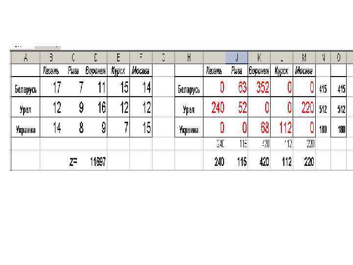• Пример 2 (транспортная задача). Требуется минимизировать затраты на перевозку товаров от предприятий-производителей (Республика Беларусь, Урал, Украина) на торговые склады (Казань, Рига, Воронеж, Курск, Москва). При этом необходимо учесть возможности поставок каждого из производителей (Республика Беларусь – 415 поставок, Урал – 512 поставок, Украина – 180 поставок) при максимальном удовлетворении запросов в поставках потребителей (Казань – 240, Рига – 115, Воронеж – 420, Курск – 112, Москва – 220). • Затраты на одну поставку приведены в следующей таблице
