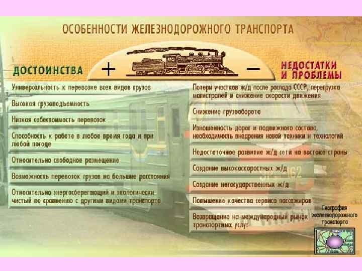 Железнодорожный транспортведущий в российской транспортной системе. Чем это вызвано? Можно отметить несколько аспектов данного вопроса: 1. Исторический. 2. 2. Пространственно-географический. 3. 3. Экономический. (Попробуем раскрыть? )