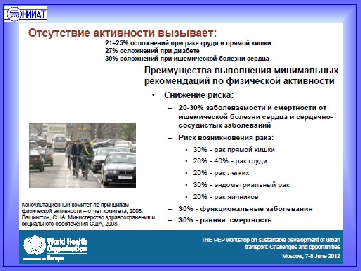 Виды негативного воздействия АТ на окружающую среду и здоровье населения в городах Выбросы вредных веществ: СО, СН, NOX, PM, SO 2 • 60 -80% суммарного загрязнения • Превышение ПДКсс вдоль магистрали в 1, 4 -2 раз по сравнению с жилыми территориями Выбросы парниковых газов: CO 2, CH 4, N 2 O Шум, вибрация, электромагнитное излучение Отчуждение земли под транспортную инфраструктуру и стоянки До 20% суммарных выбросов ПГ в городе 30 -40% территории в зоне сверхнормативного шумового транспортного загрязнения • Потеря до 60 -70% внутридворовых территорий • Разрушение естественных ландшафтов • 15 -20% территорий города использовано под транспортную инфраструктуру CO 2 Влияние на здоровье Заболевания дыхательной и сердечно-сосудистой систем, онкология Гиподинамия, стрессы, ожирение Отходы, сбросы • Утилизация только 50% образующихся отходов • Загрязнение земли и воды Риски для здоровья: 20 тыс. - преждевременных смертей в РФ, риск развития канцерогенных эффектов у москвичей находится на уровне сигнального (2, 7· 10 -4), свидетельствующего о критическом уровне загрязнения атмосферного воздуха формальдегидом и бензолом.
