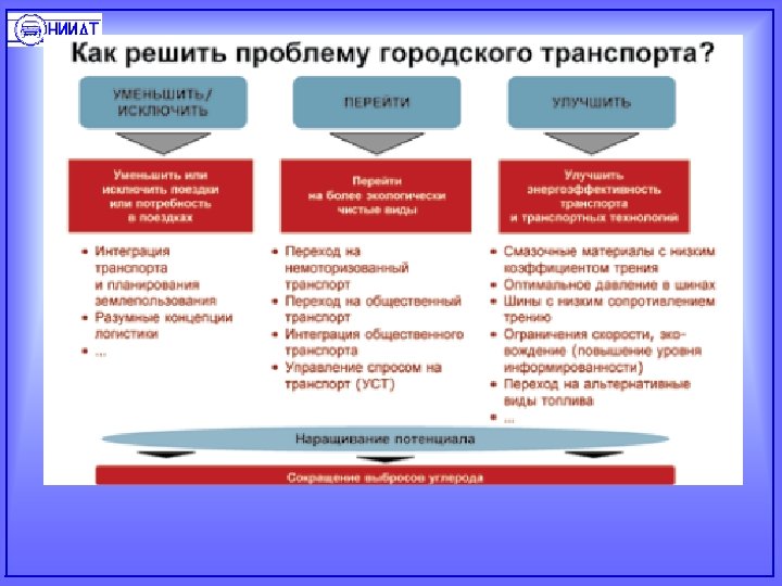 Транспортные проблемы городов должны решаться с позиций обеспечения высокого качества жизни для всего населения ( «города пригодные для жизни» ). На первом месте должны стоять меры, направленные на: * рационализацию и сокращение (прекращение нерациональной генерации) транспортного спроса населения и экономики; * управление транспортным спросом, переключение его на более эффективные и безопасные виды транспорта; * предоставление качественных альтернатив личному автотранспорту (общественный пассажирский транспорт, включая BRT и LRT); * повышение безопасности работы транспортной системы.