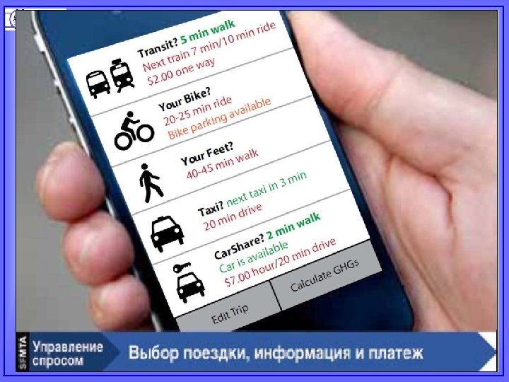 Некоторые меры регулирования транспортного спроса ► ► ► Обустройство «перехватывающих парковок» в стыковке с остановками ОПТ Оптимизация тарифов на общественном пассажирском транспорте ► Координация работы различных видов ОПТ, организация мультимодальных пассажирских перевозок ► Градостроительство и землепользование Предоставление общественному пассажирскому транспорту приоритета в дорожном движении ► Повышение качества услуг пассажирского транспорта Оптимизация существующей маршрутной сети и организация новых маршрутов «Транспортная экспертиза» документов градостроительного планирования и инвестиционных проектов ► Обеспечение максимальной «транспортной самодостаточности» городских районов ► Переход к «полицентрической» модели развития городской территории