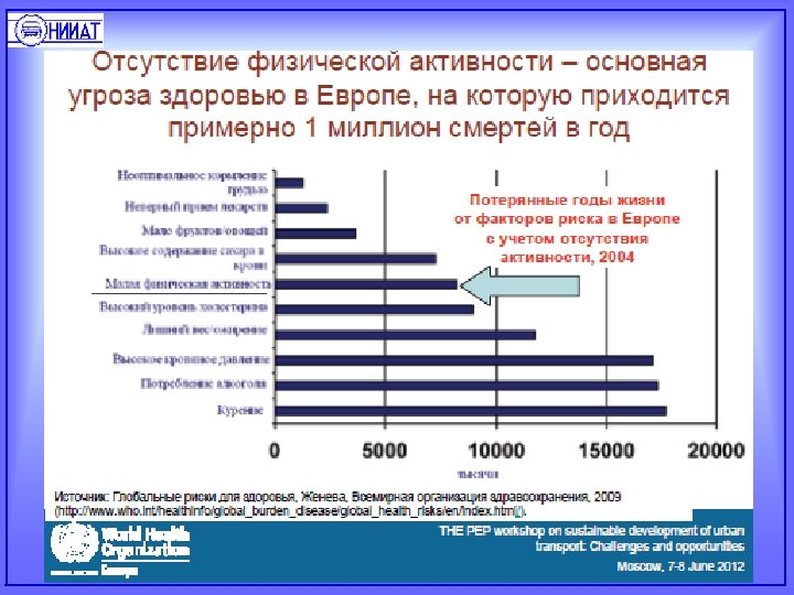 Влияние транспорта на здоровье населения Дополнительные случаи или дни вследствие загрязнения окружающей среды Показатель Случаи или дни вследствие общего загрязнения воздуха Случаи или дни вследствие загрязнения воздуха автотранспортом Австрия Число преждевременных смертельных случаев в долгосрочной перспективе (взрослые > 30 лет) Число поступлений в больницы с респираторными заболеваниями Число поступлений в больницы с кардиоваскулярными заболеваниями Число дней потери работоспособности (взрослые > 20 лет) Франция Швейцария Австрия Франция Швейцария 5600 31700 3300 2400 (42%) 17600 (56%) 1800 (55%) 3 400 13 800 1 300 1500 (44%) 7700 (56%) 700 (54%) 6 700 19 800 3 000 2900 (43%) 11000 (56%) 1600 (53%) 3 100 000 24 600 000 2 800 000 1 300 000 (42%) 13 700 000 (56%) 1 500 000 (54%)