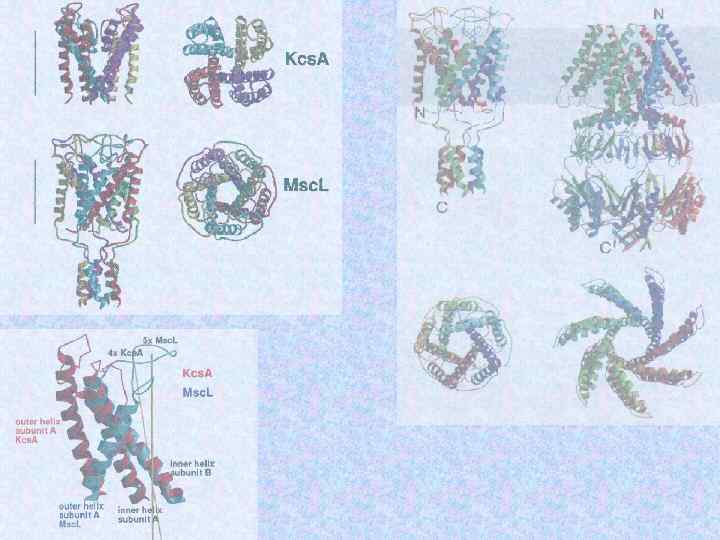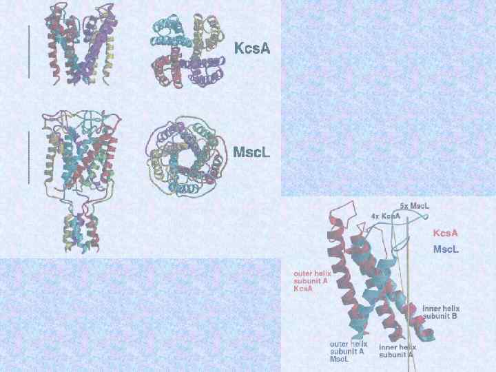 Mechanosensitive and voltage activated channel from E. Coli of small conductance ~ 1 n. S (Msc. S). TM 3 helices lining pore, TM 1 and TM 2 are candidates for the tension and voltage sensor.