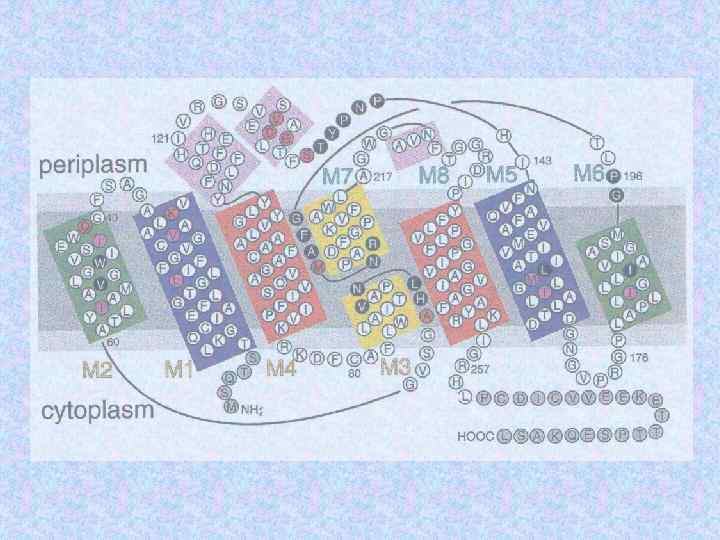 Peptide transporter Membrane domains in green – substrate-binding part; colored residues are critical to function